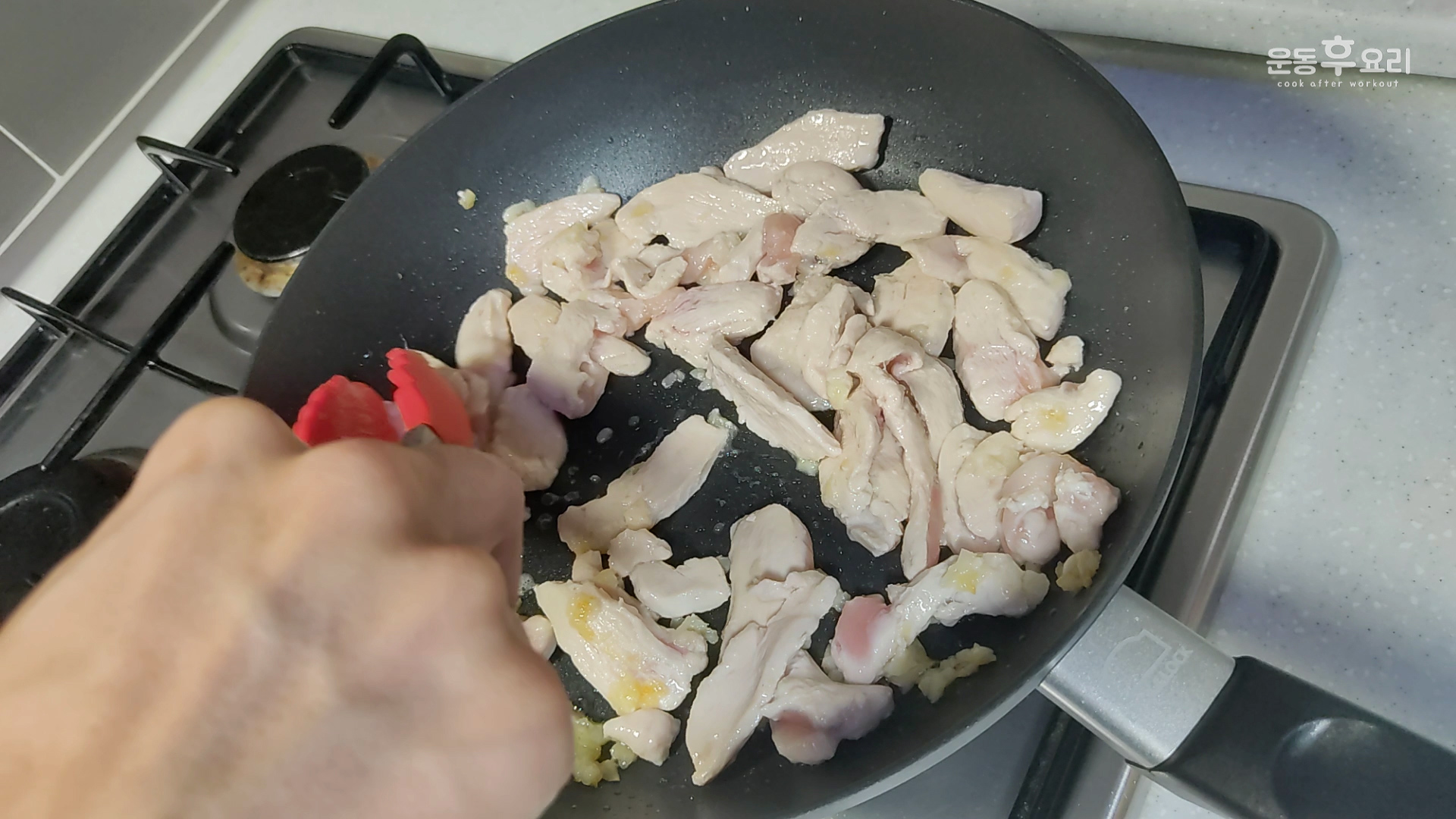 닭가슴살이 충분히 익을 때 까지 볶아주세요.