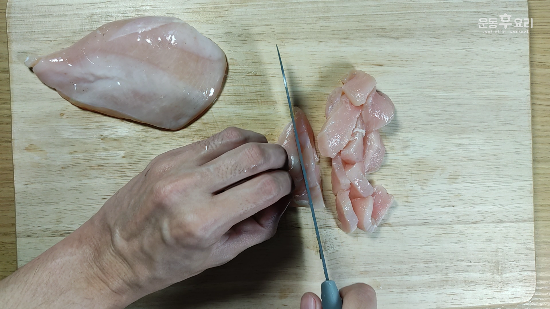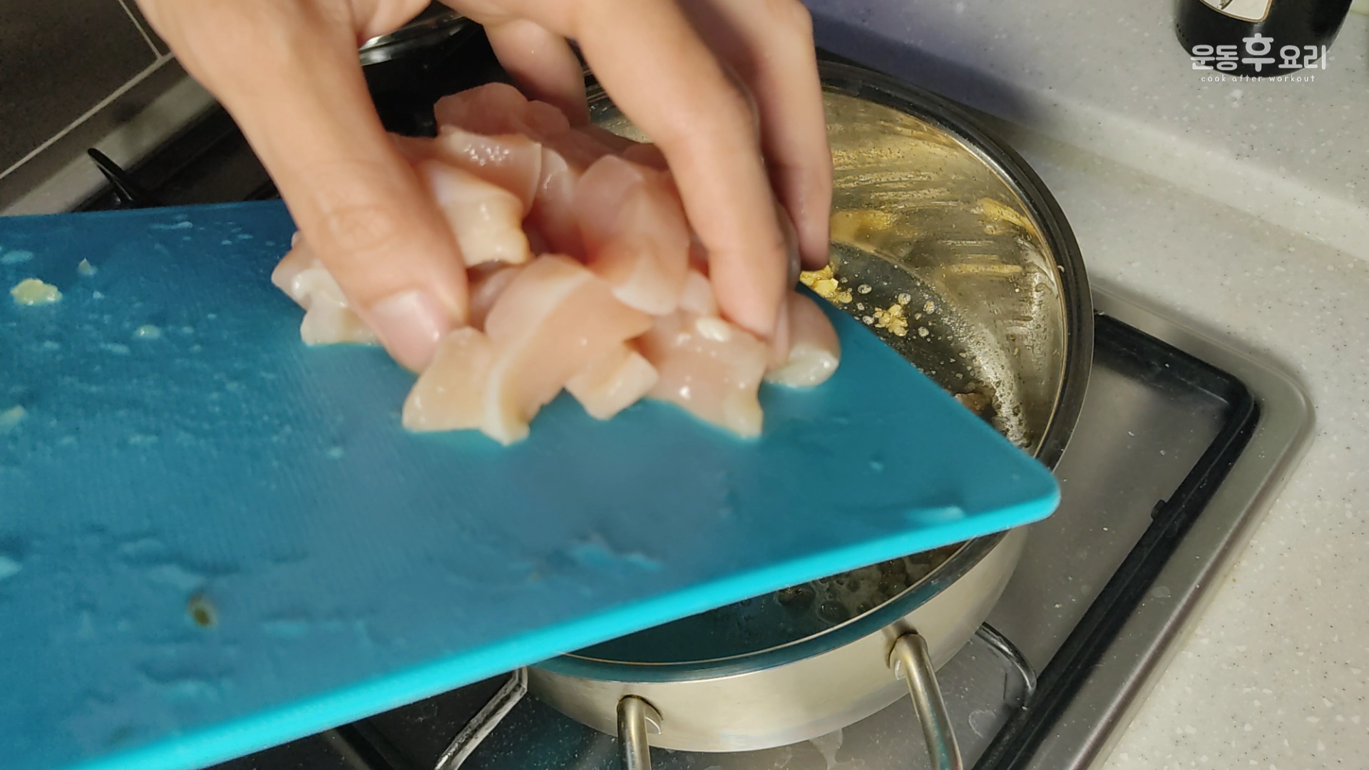 1분이 지나면 닭가슴살과 맛술 2스푼을 넣고