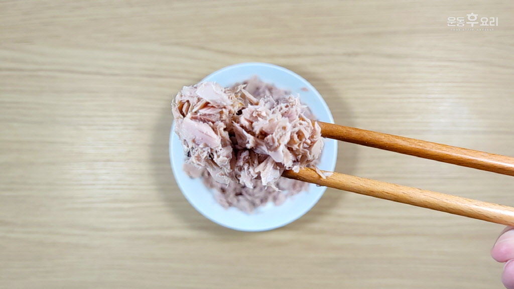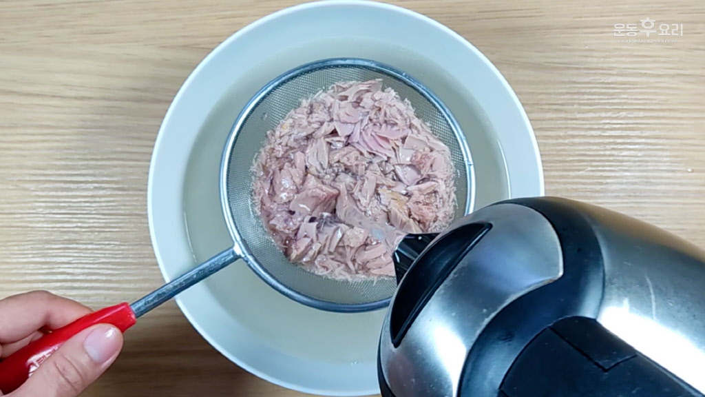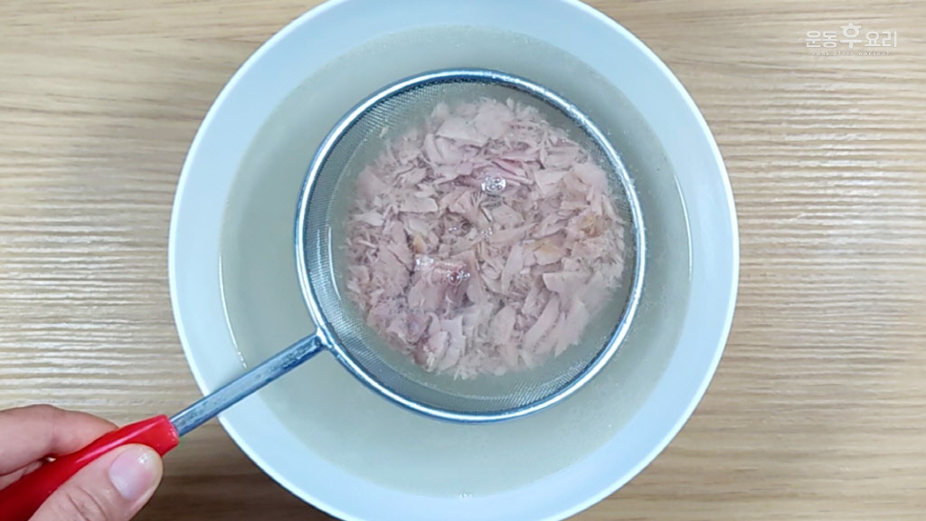 뜨거운 물에 참치를 20~30초 정도 담가두면 기름이 둥둥 뜨면서 기름이 빠지게 됩니다.