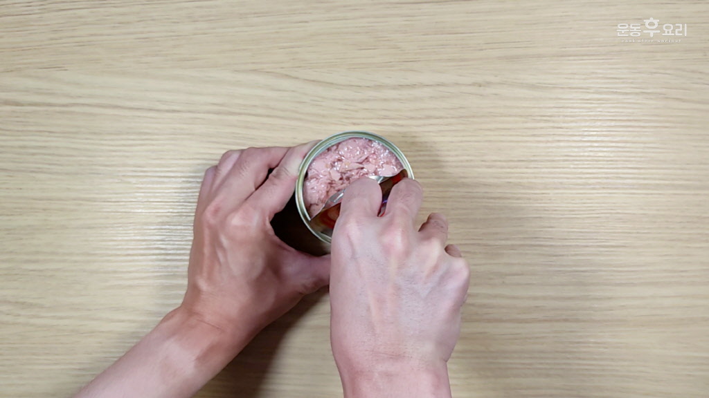 참치캔의 뚜껑을 엄지손가락으로 서서히 눌러가며 기름을 빼주세요.