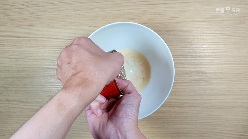 그리고 참치 위에 뜨거운 물을 부어주면서 그릇에 물을 받아주세요.