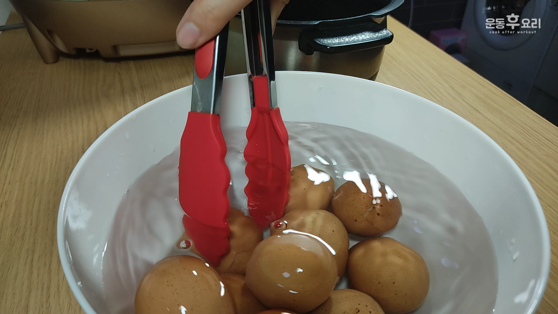 40분이 지나면, 뚜껑을 열어 계란을 찬물로 헹궈줍니다.